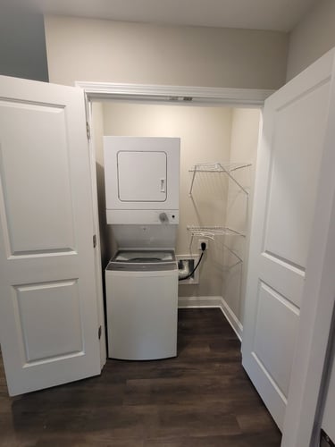 Each unit features a stacked washer/dryer combo unit for personal use with hanging storage space.