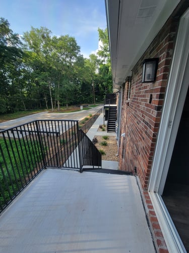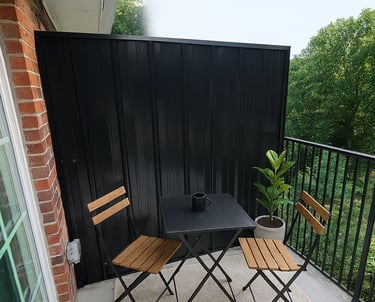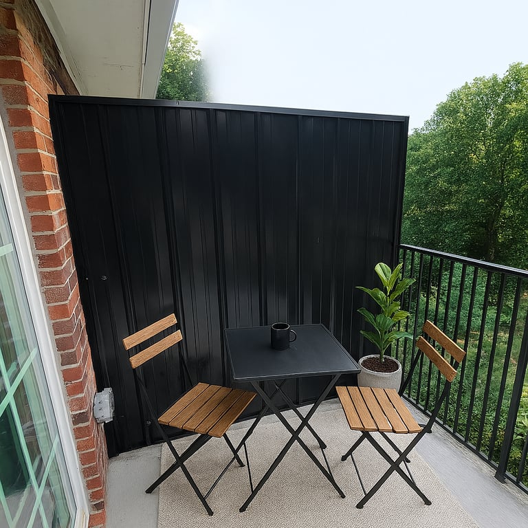 Example balcony set up with privacy wall between each unit using a bistro table , chairs & potted plant