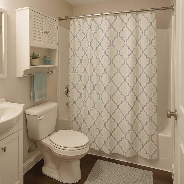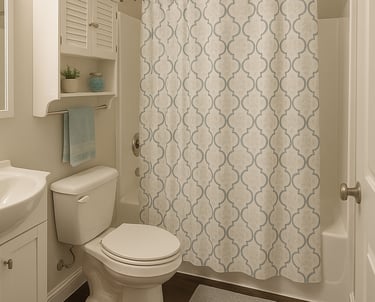 Example of bathroom with shower curtain and large towel bar out of view behind the door