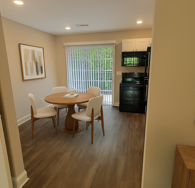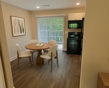 Example table in kitchen/dining w/ a round 4 person dining table (corner pantry cabinet out of view to left)
